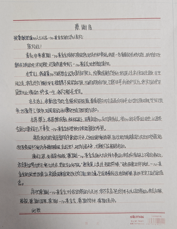 此次探访中,志愿者还了解到其他困难家庭的不同境遇:有的父母残疾丧失劳动能力,有的家人重病拖累经济,有的孩子因监护人去世或父母离异成为事实孤儿。志愿者细致询问每个学生的家庭、学习与生活状况,倾听他们的需求与愿望,深深感受到孩子们对知识的渴望与对未来的憧憬。学生们也通过手写感谢信表达了真挚谢意。