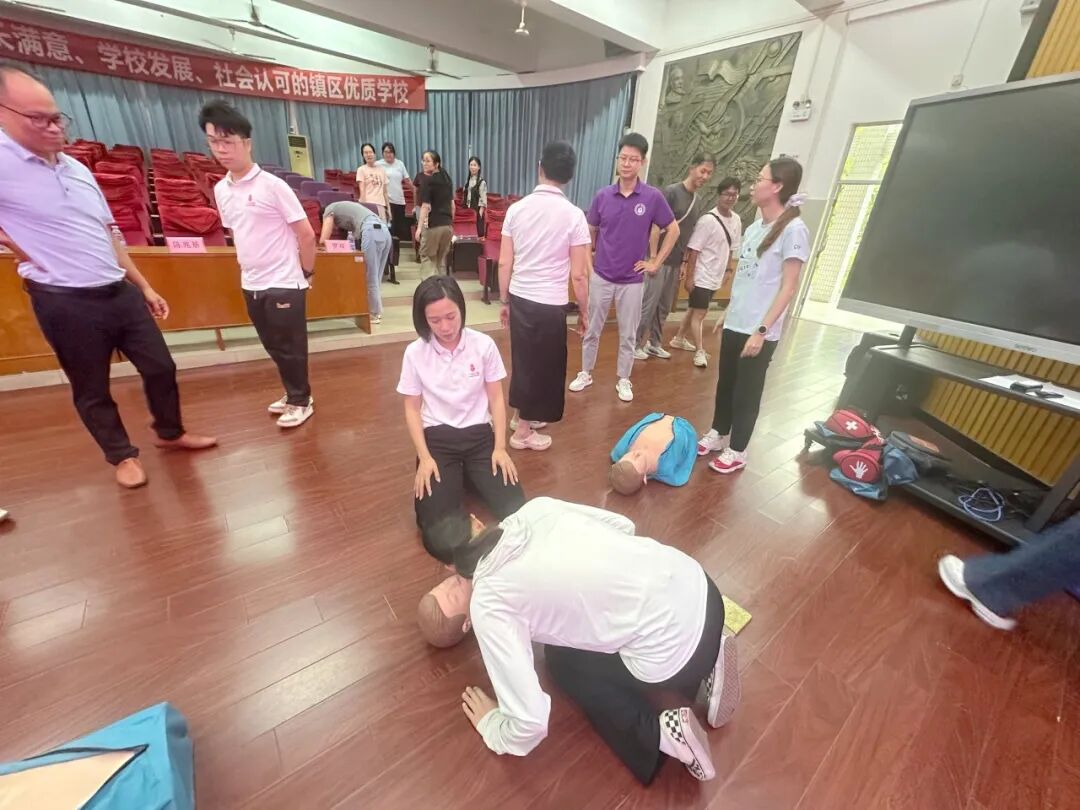 在各校活动现场,专业培训讲师为教职工及学生代表带来了生动而实用的应急救护课程。内容包括心肺复苏(CPR)的操作流程、AED的使用方法以及常见急症的现场处理等。培训分为综合理论和模拟实操两个部分。培训导师结合课件与教学视频,向大家重点讲解了成人心肺复苏术的理论知识、胸外按压的注意技巧、自动体外除颤仪的使用方法。