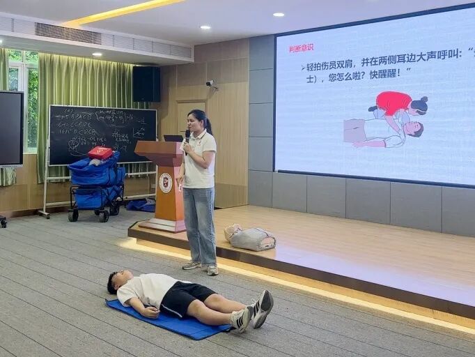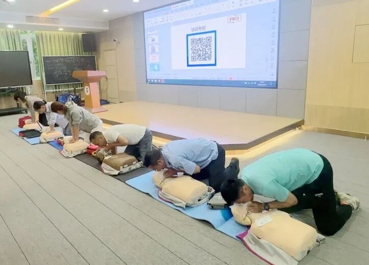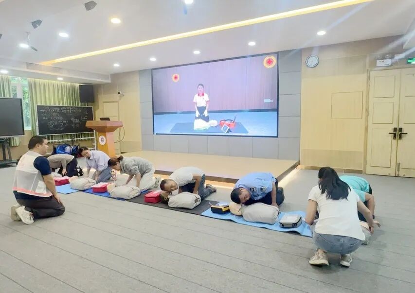 实操环节中,罗老师借助人体模型,现场演示了心肺复苏的按压姿势、力度、频率以及AED设备的开机、电极片粘贴、电击除颤等操作步骤,耐心解答师生们的疑问,并逐一纠正不规范动作,确保每位参训者都能掌握急救技巧。