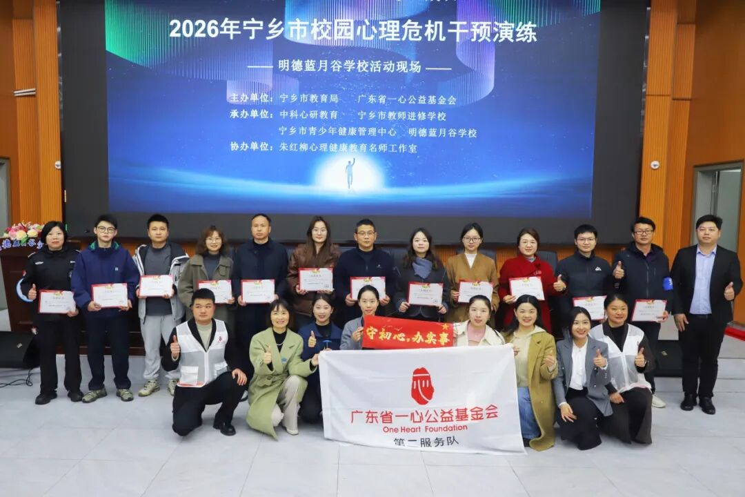 2026年3月25日至27日,广东省一心公益基金会第二服务队联合中科心研(东莞)教育科技有限公司、朱红柳心理健康教育名师工作室,在湖南宁乡明德蓝月谷学校举办校园心理危机干预演练,为宁乡市各学校心理教师及相关负责人提供专业指导。