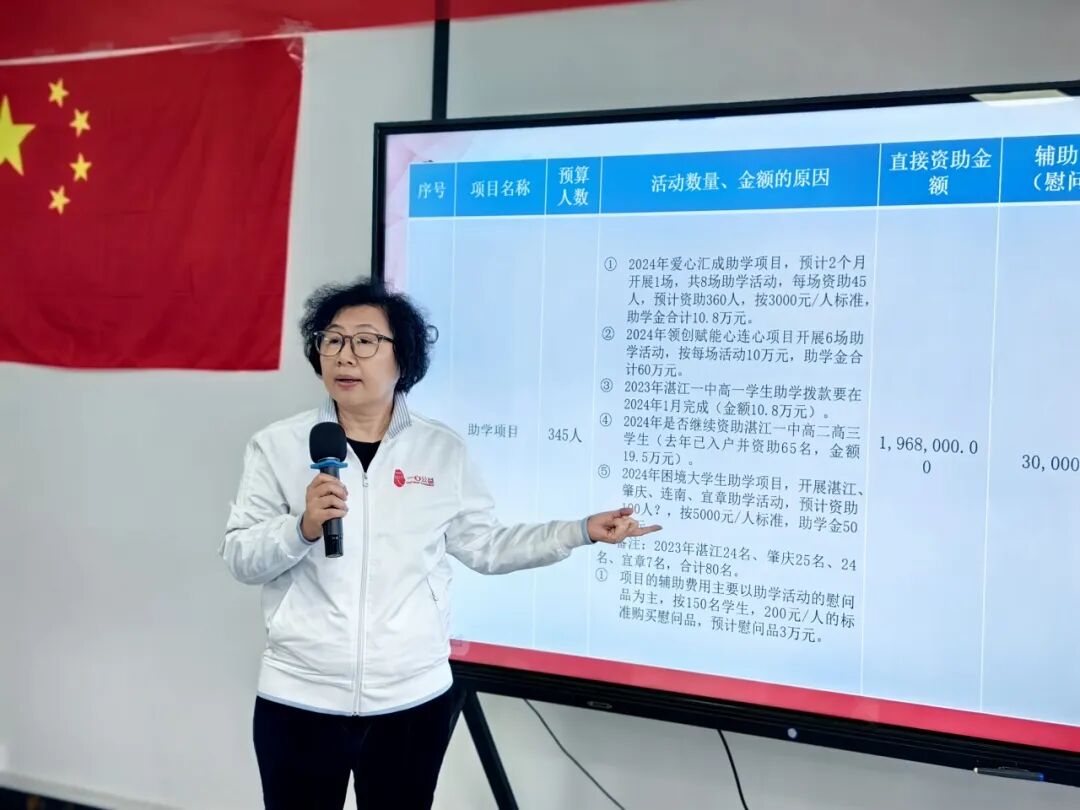 服务队理事陈维政、罗定中、王钦分别汇报了9月至11月救心项目、大病救助项目、助学项目的执行情况;理事梁好汇报了9月至11月库存物资的盘点情况;服务队队长麦卫红汇报2024年度项目预算表及行政经费预算表。