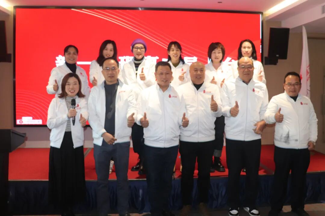 新一届理事及主要干部亮相,基金会副监事长王金伟向新一届服务队队长张贻武师兄授旗,同时新任队长张贻武向上一任队长王金伟献上感恩的花束。现场响起热烈的掌声,祝贺新一届领导班子成立。