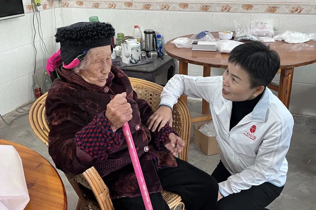 廖姨今年98岁,和孙女住在扬眉村里,孙女从出生以来就是盲人。廖姨的孩子们都出去务工了,孙女行动不便,由廖姨照顾她的日常起居。廖姨表示,她身体很硬朗,感谢志愿来看望她们,她感到非常欣慰。