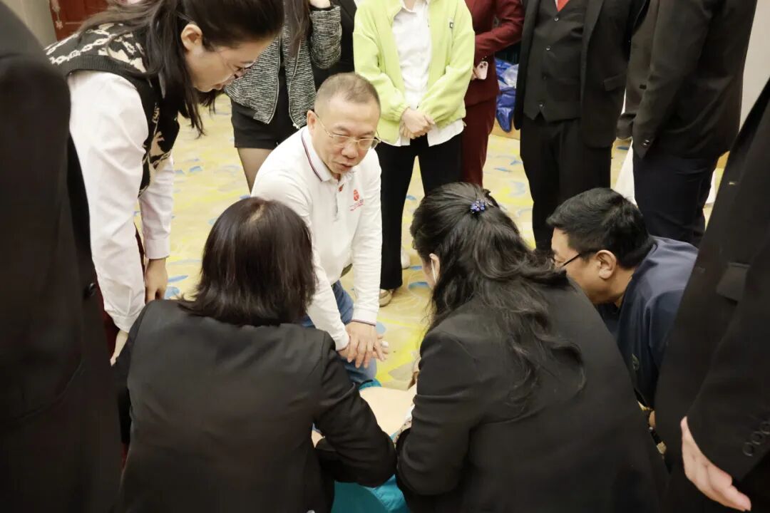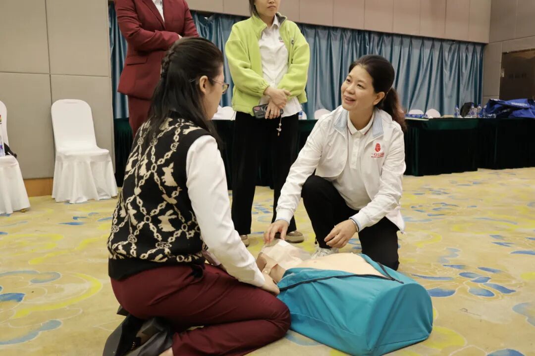 然后,学员们跟随着导师的指令,积极参与练习,对模拟假人进行胸外按压、人工呼吸及AED的使用等急救实操。针对学员在练习过程中出现的错误操作,导师细致回答,并演示正确的动作要领,现场学习气氛浓厚。