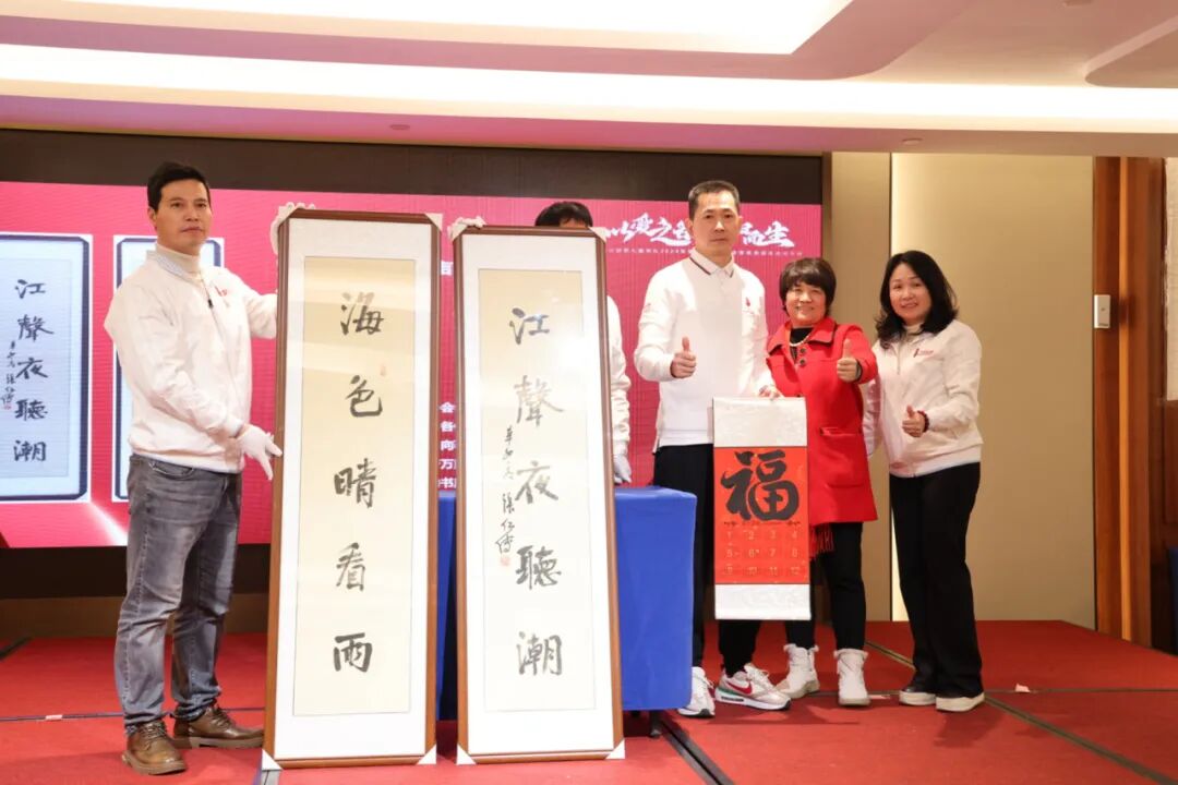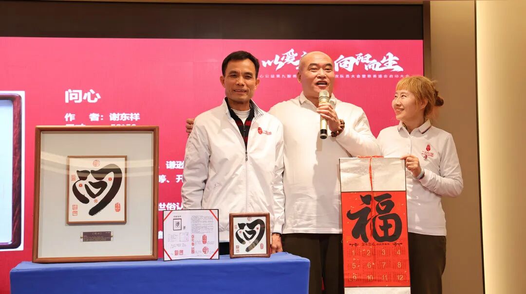 接下来,会议进入了本年度慈善盛会启动仪式。由爱心嘉宾、艺术家及服务队师兄师姐捐赠的共24件艺术作品在慈善盛会启动环节中亮相。基金会理事长谢东祥向现场嘉宾介绍了作品“问”字和“福”字的丰富内涵,点燃了现场热烈的竞拍气氛。