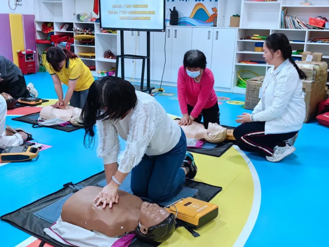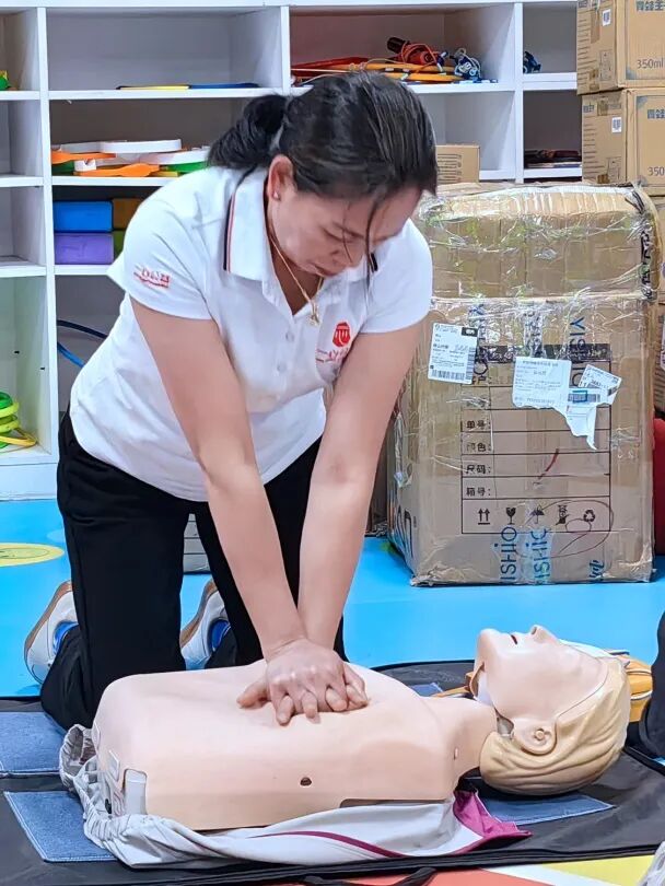 此外,杨老师向大家演示了心肺复苏的实操方法。学员们认真学习操作过程的重点和注意事项。随后,学员们分成6组进行模拟实操,老师和助教给学员们进行细致的指导,纠正错误的动作。
