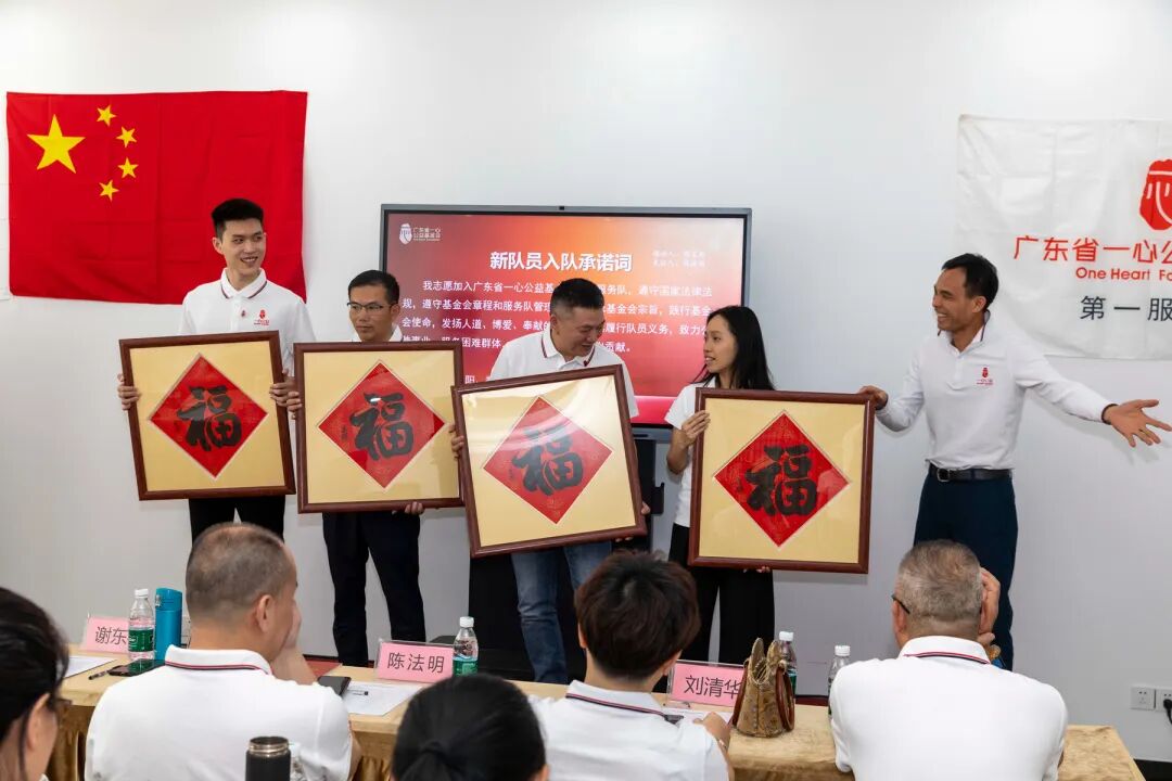 在基金会副理事长陈法明的见证下,队长侯家胜带领新队员完成入队承诺仪式。基金会理事长给新队员送上了福字。