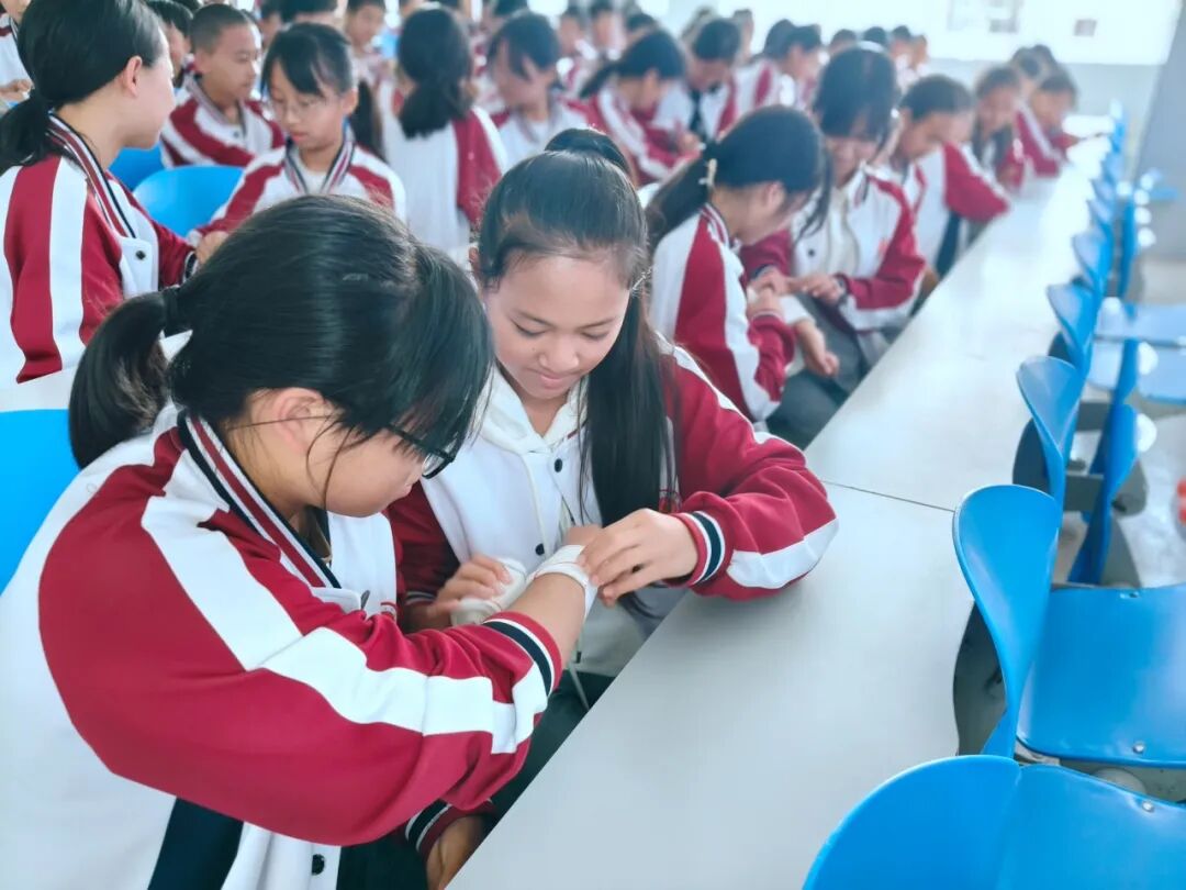 在教室里,导师通过课件和视频讲解了溺水和中暑的急救方法、海姆立克法和创伤包扎方法等知识。在学习创伤包扎的环节,学生们纷纷拿起纱布帮助邻桌的同学模拟急救包扎。