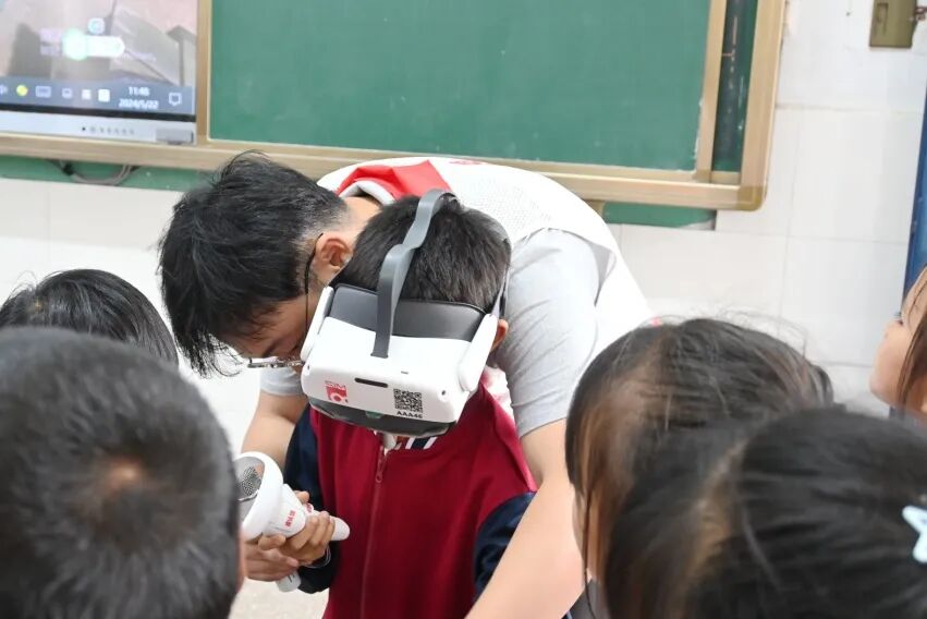 另外,导师团队准备了VR眼镜,让学生们可以更真实的体验到急救的操作流程。学生在体验VR的同时,其他同学可以通过投屏看到实时画面,课堂的学习氛围非常浓厚。培训期间,志愿者给学生们派发了用于激励的学习用品,都是由许多爱心人士捐赠的。