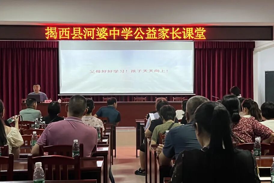 此外,在河婆中学,主讲人还为一百多名学生家长开展了“家长课堂”,从当代儿童心理健康、育儿智慧等多个方面进行讲解,引导家长们如何与孩子进行有效沟通,帮助孩子身心健康发展。