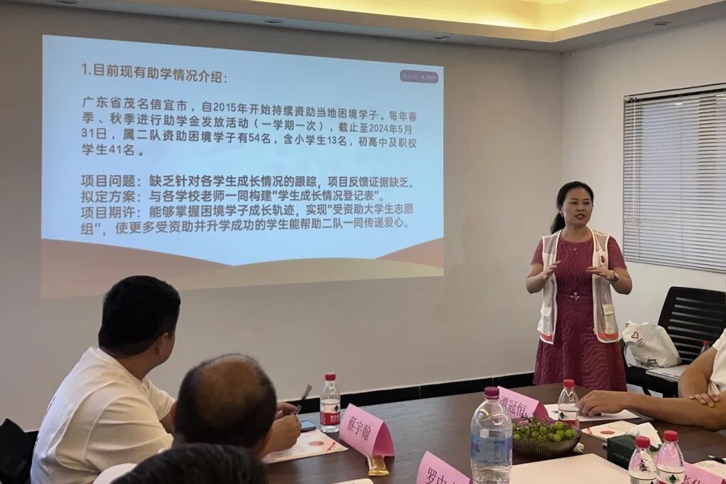 随后,服务队干事汇报了服务队第一季度开展乡村振兴项目进度,以及遇到的问题。服务队财务管理委员会主任黄浩强汇报了服务队上半年的财务数据。服务队恤孤助学委员会主任钟凤姣汇报了助学项目开展情况,提出希望倡导更多有爱心的队员关注并参与到助学活动中。