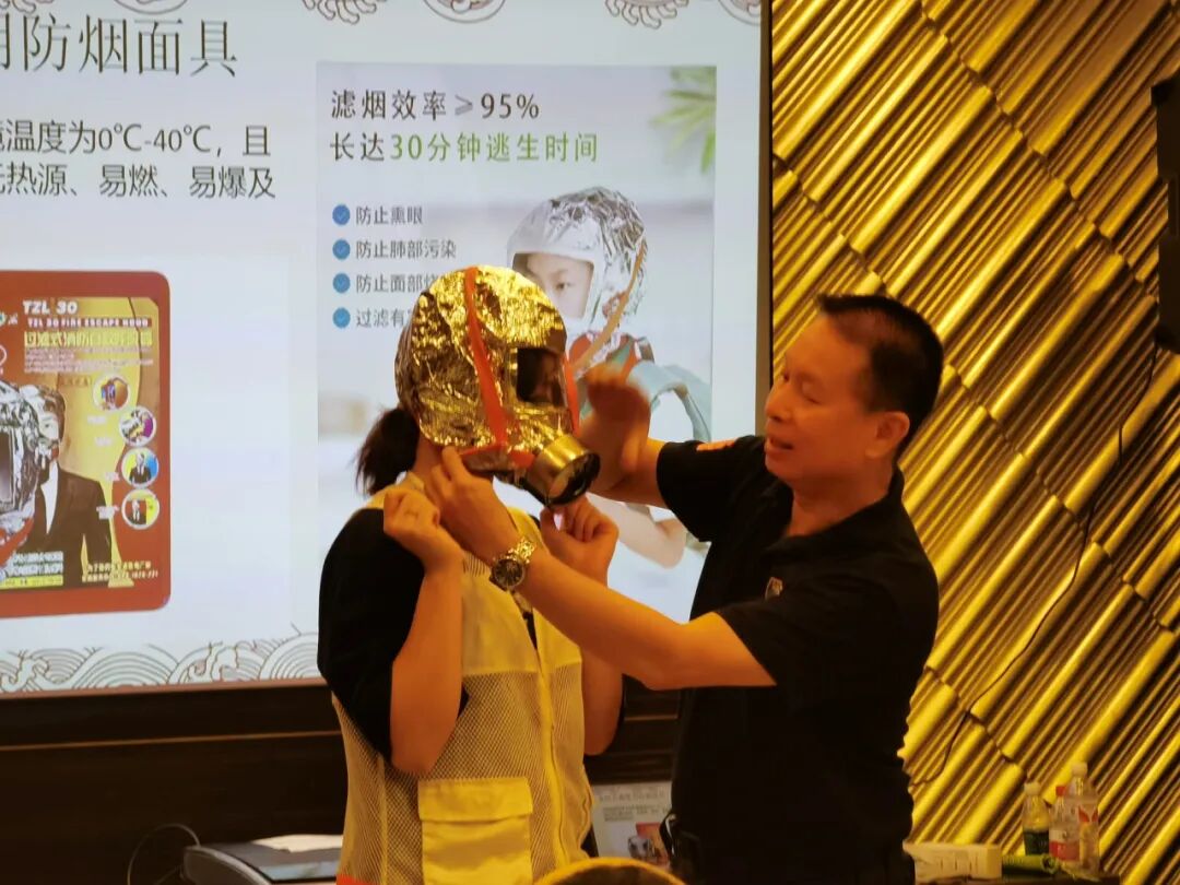 其后,导师讲解了发生火灾的应对措施,从多个情况分析逃生路线,并请学员学习多种逃生方法,学习如何结绳逃生等技能。导师还介绍了火灾浓烟的毒害性,介绍了防烟面具、灭火器等消防工具的使用方法。