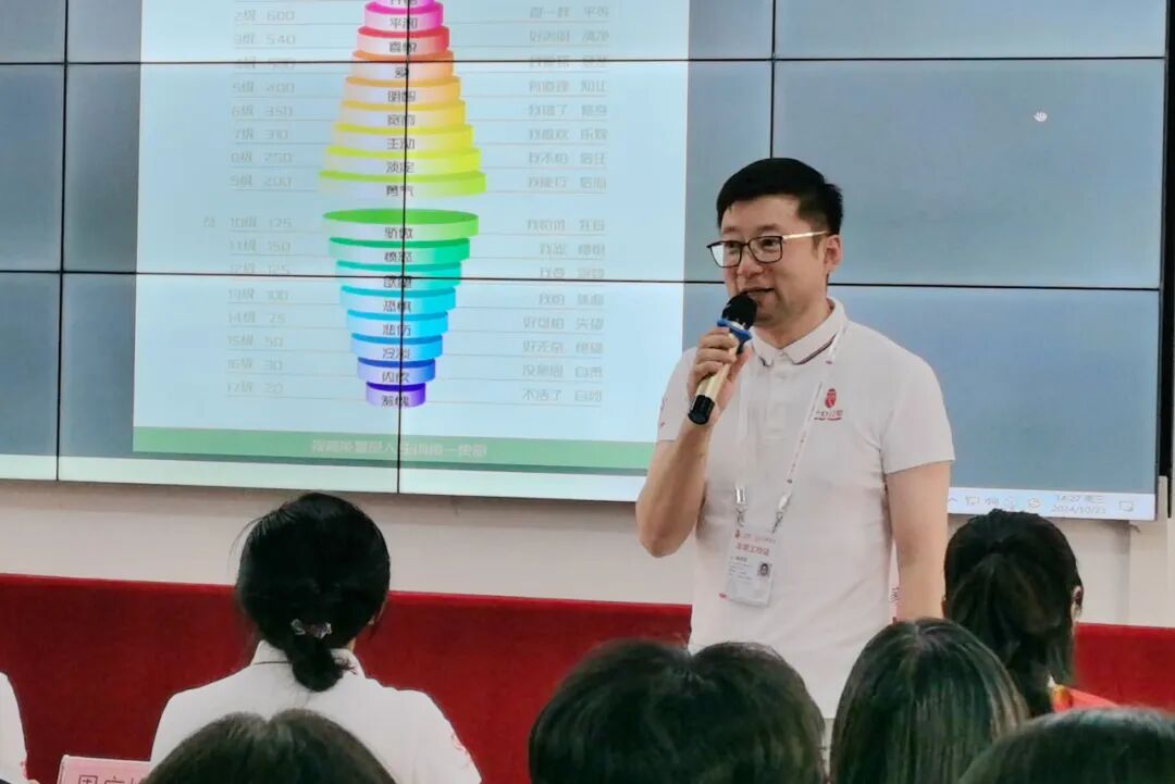 第一服务队队长侯家胜发言,希望受资助的学生珍惜学习机会,树立远大理想,好好学习,自强不息。他还分享了霍金斯情绪能量表的相关内容,希望同学们可以正确认识自己的情绪,掌控情绪、茁壮成长。
