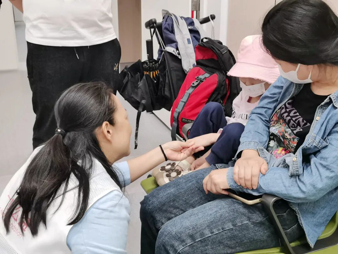 在医院的化疗中心,队员们见到了正在等待治疗的心心以及她的父母。一家人来自汕头,爸爸表示自从患病后心心变得越发胆小和内向。队员们轻声与心心打招呼,她害羞地回应着。
