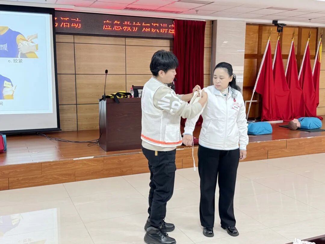 最后,讲师向大家介绍了外伤处置的方法,示范了如何正确止血。课堂上还派发了纱布,讲师悉心教导学员进行实操。现场的学员们纷纷与同伴练习包扎,培训现场学习氛围浓厚。