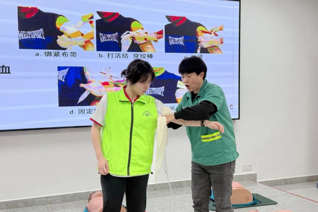 接着,李教授介绍了止血带使用原则、加压包扎技巧等内容,带领学员在互帮互助中掌握三角巾包扎、骨折固定等实用技能。教学现场分发了医用敷料包,学员在讲师手把手指导下完成环形包扎、螺旋反折等十余种包扎技法的标准化操作。