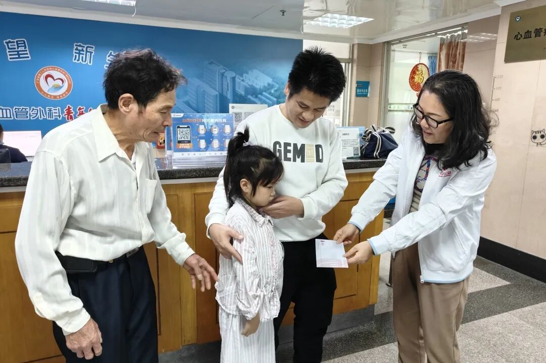 在病房中,队员们见到了小雯的爸爸、爷爷和小雯。据了解,小雯于2016年在湛江早产出生,出生后被确诊患有复杂性先心病。因家庭经济困难,一直未能接受救治手术。2024年,小雯参加了服务队组织的湛江地区先心病筛查活动。此后,服务队积极为她联系医院。今年2月13日小雯入院,2月19日顺利完成手术,目前已出院回家,治疗总费用为7.6万元。