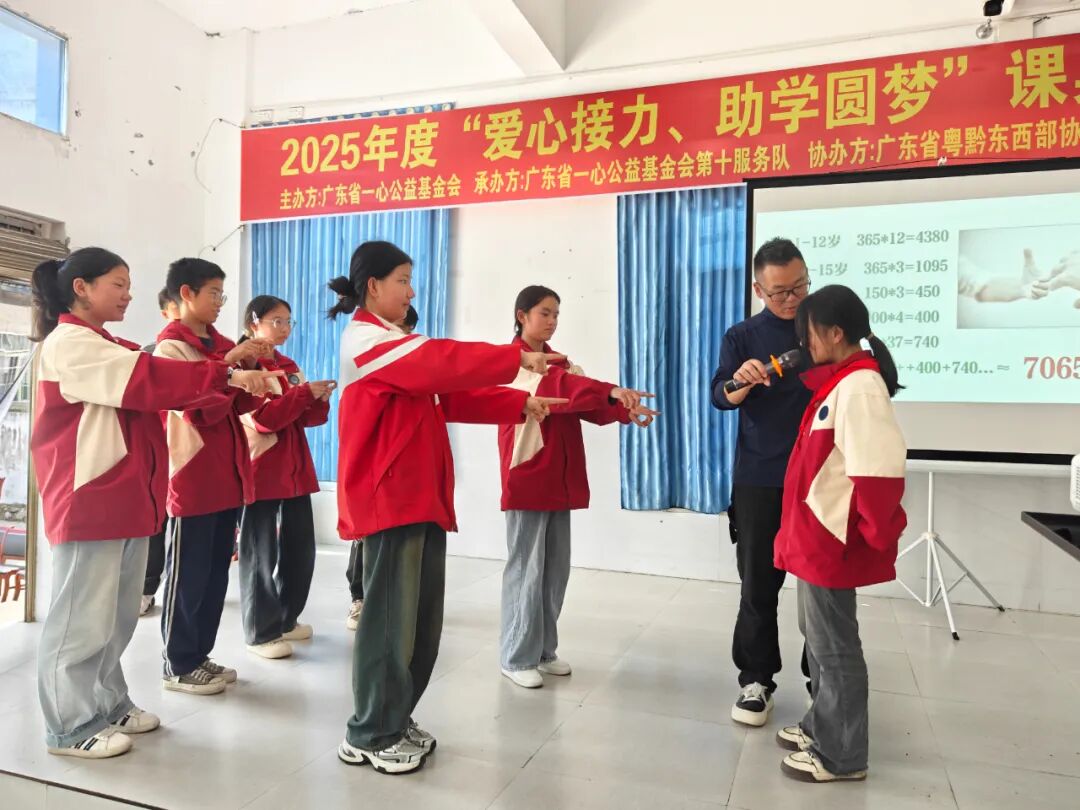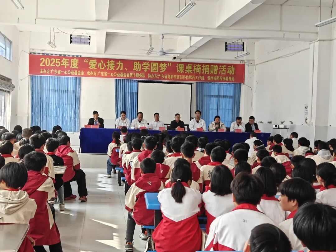 2025年4月11日,广东省一心公益基金会第十服务队联合黔西市教育局、织金县政府分别在黔西市永燊中学、织金县茶店乡中心学校举办一场“爱心接力.助学圆梦”课桌椅捐赠活动,向每所学校捐赠200套课桌椅,同时探访10位品学兼优的学生,并送上慰问金、慰问品,合计约5.1万元。