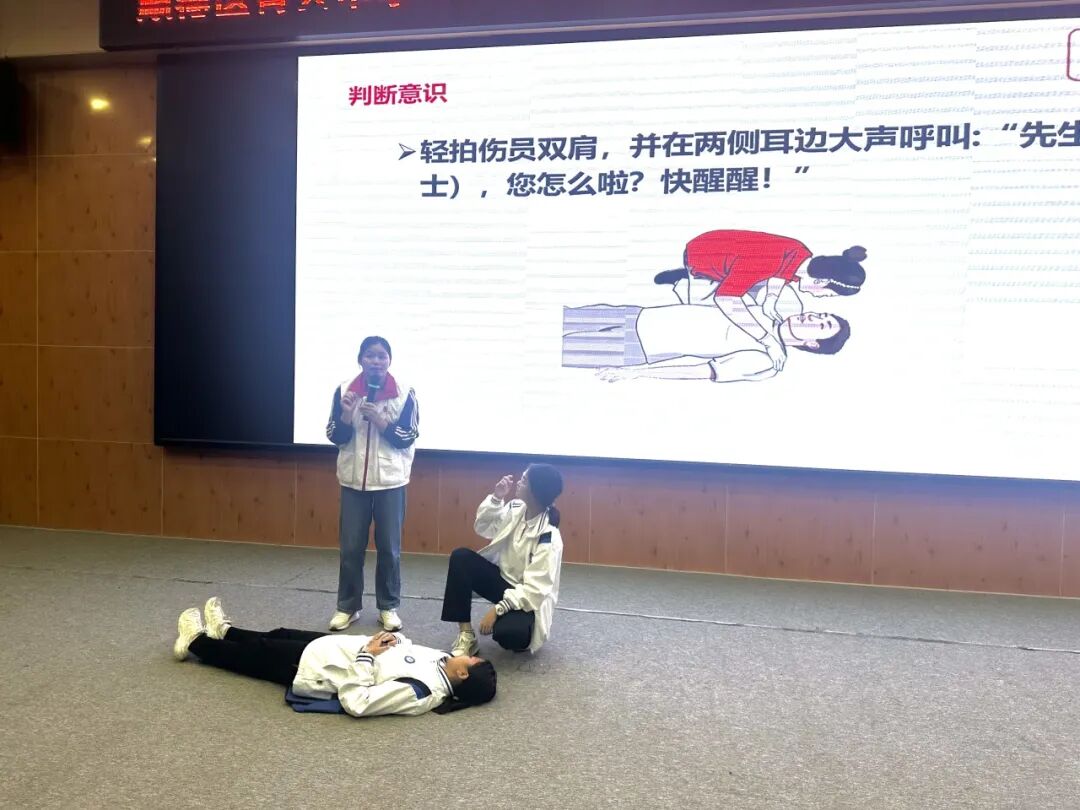 捐赠仪式后,活动进入了核心环节——应急救护培训,156名师生参与了本次培训。培训导师为在场师生系统讲解了心肺复苏(CPR)的基本知识、操作要点以及AED设备的正确使用方法。培训内容详实,注重实操,通过生动的案例和模拟演示,让师生们深刻认识到在突发心脏骤停的“黄金4分钟”内进行有效急救的重要性。师生们认真聆听,并在培训师的指导下进行了实操练习,现场学习氛围浓厚。