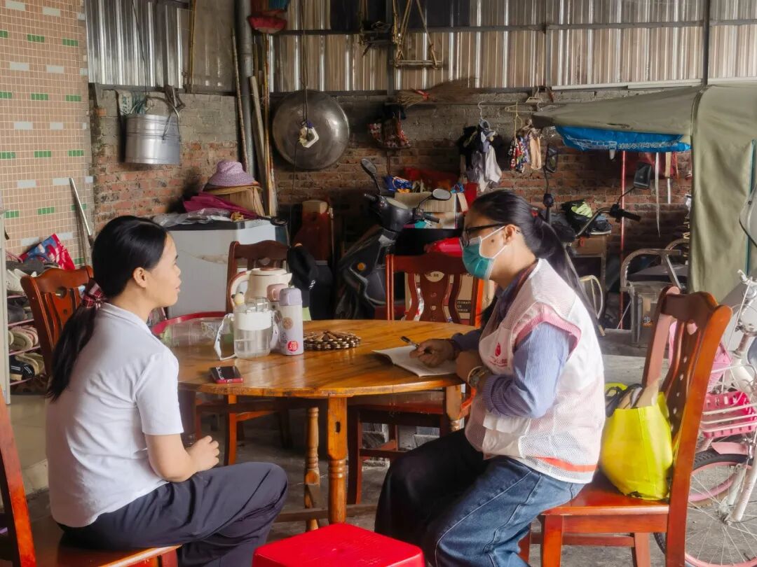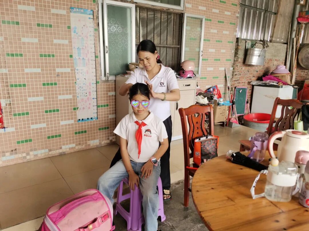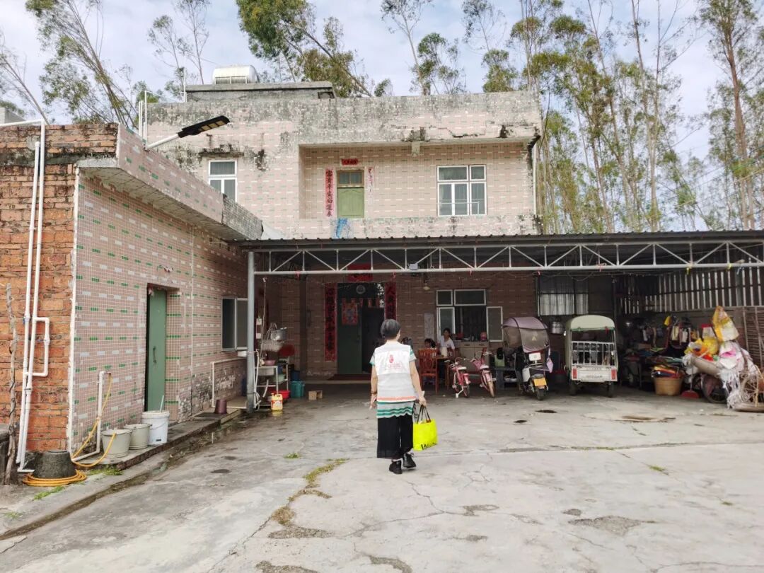 义工们抵达小琪家中,见到了小琪及其母亲。小琪一家八口居住在自建的两层简陋楼房里,楼房外墙受岁月与湿气侵蚀,深褐与灰绿的水渍清晰可见。