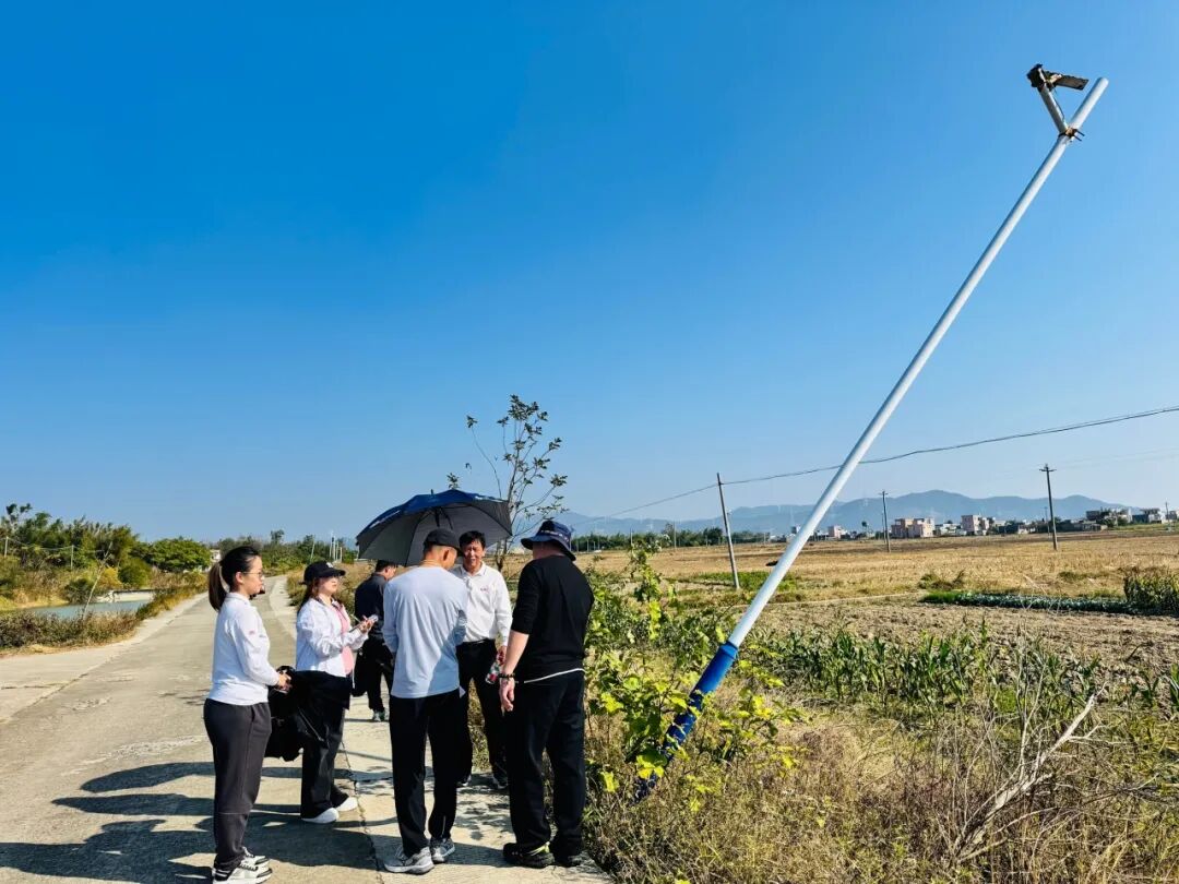 考察发现,受2025年台风“桦加沙”影响,村中多数路灯出现太阳能板损坏、灯杆歪斜甚至断裂等问题。尽管大沟镇工作队已购置一批太阳能路灯进行了部分更换,但由于两村辖区范围大、自然村分布分散,部分进村道路仍缺乏照明,既给村民出行带来不便,也存在明显安全隐患。