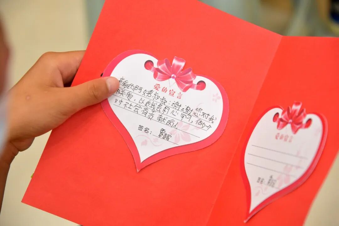 受助儿童们用稚嫩、悦耳的声音唱起一首《听我说谢谢你》,并亲手制作了“礼物”送给服务队的“爱心父母”,一封感谢的信件、一张自制的卡片、一幅简单的图画、一捧美丽的鲜花等礼物,让在场的志愿者们都感动不已。