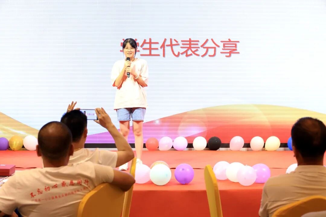 接着,服务队邀请了一对一帮扶的受助学生代表李同学来到现场,李同学上台分享了经过自己的刻苦学习,在本次高考中取得了理想的成绩,分数能达到升读大学本科的标准。