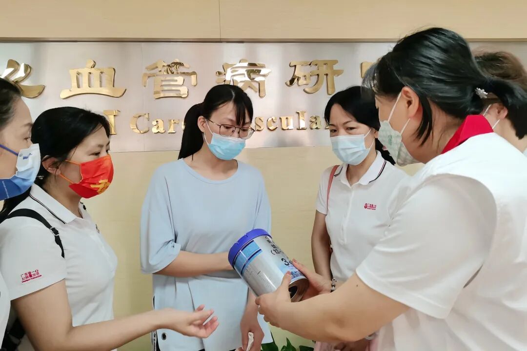 探访中,队员们安抚患者及其家属坚定信心,勇敢面对逆境,并向他们送上营养奶粉等慰问品。