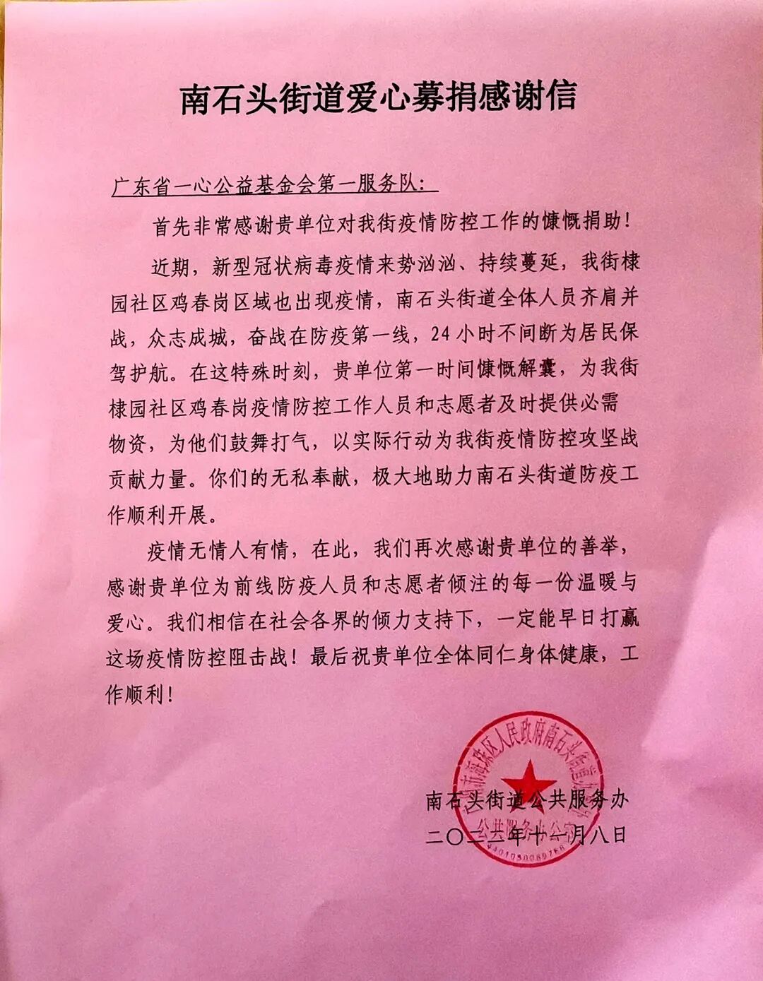 早在2020年2月的抗疫行动中,广东省一心公益基金会第一服务队曾向海珠区南石头街道办的一线抗疫志愿者捐赠100套防护服。