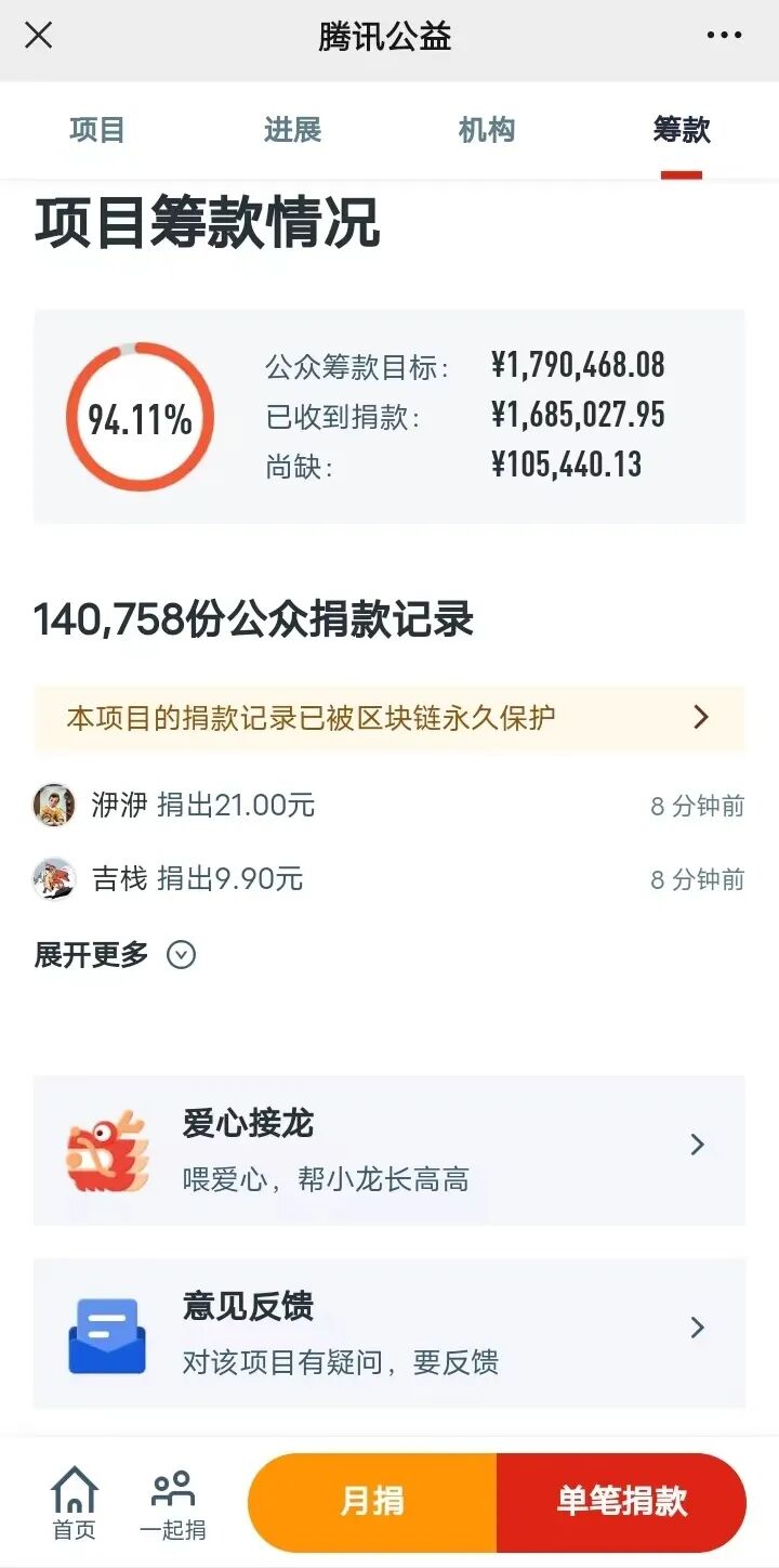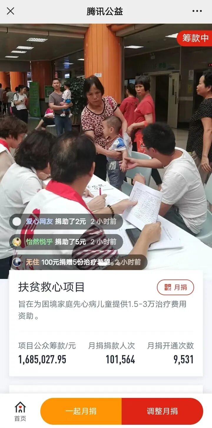 截至2022年12月26日,共有140758人参与捐赠,9531人开通月捐,筹得善款1685027.95元。在12月里,一心公益共收到12名先心病患儿求助申请资料,受疫情影响,志愿者们开展线上视频探访活动,目前已有4名孩子受到资助并已入院治疗。