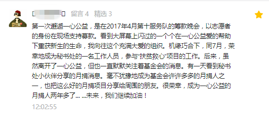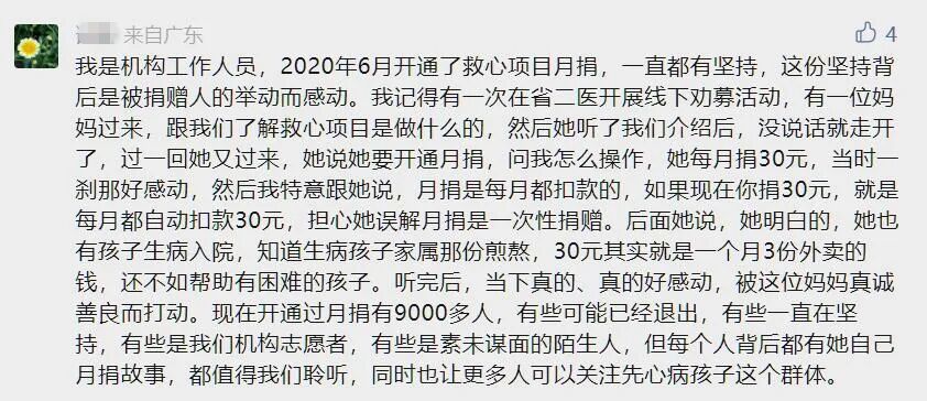 有一天,我在一心公益公众号看到月捐的推文,了解到能成为月捐人,就毫不犹豫加入了。我的孩子也是患有先心病,我能理解患病期间病友的心情,是多么煎熬、多么无助。所以,我想加入月捐,我们家经济条件一般,但是每月我愿意捐出22元,希望可以积少成多,聚沙成塔,为先心病孩子们都出一份力。