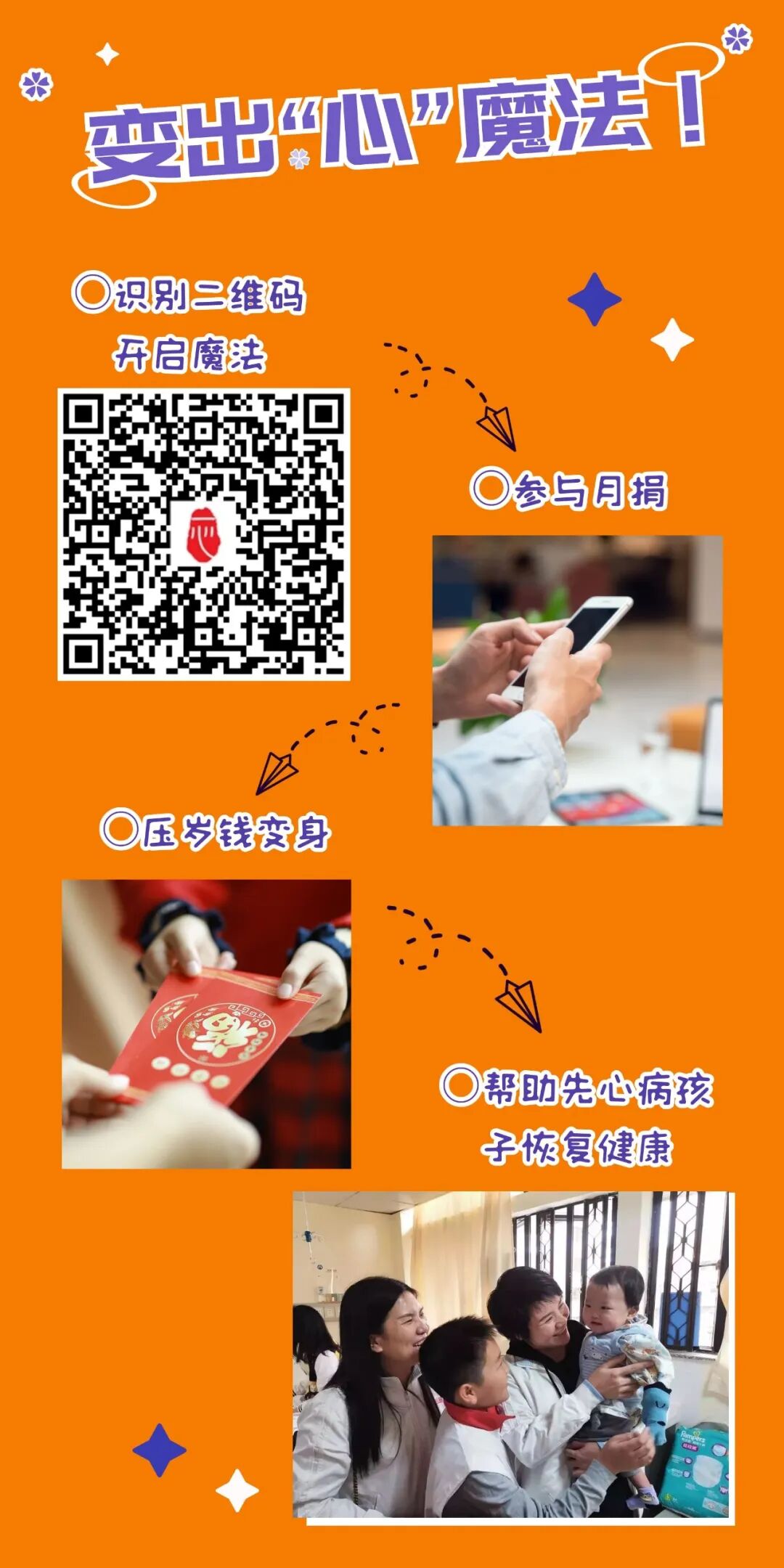 一心公益月捐计划,为扶贫“救心”项目筹款,帮助全国范围内困难家庭的先心病患儿得到治疗,让他们恢复健康,可以在阳光下一起奔跑。