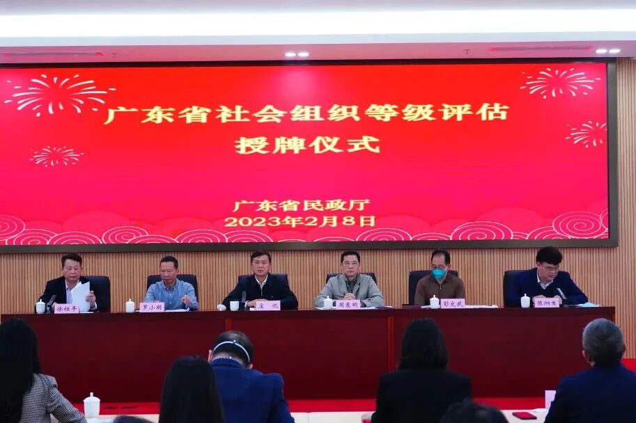2023年2月8日,广东省民政厅举行广东省社会组织等级评估授牌仪式。广东省民政厅党组成员、 副厅长、广东省社会组织管理局党组书记、局长庄侃等相关领导出席了本次会议。