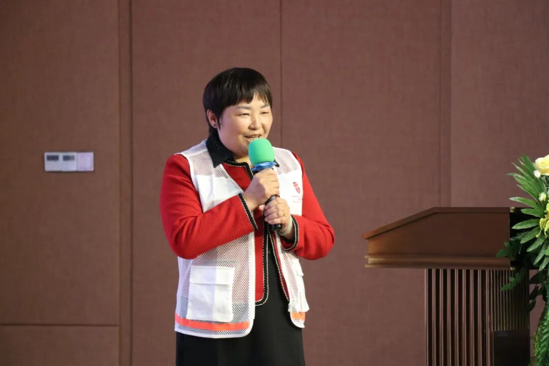 新队员张胜荣师姐上台分享。张师姐分享了她与服务队之间的公益故事,参加志愿服务活动给她带来了积极的影响,希望以后能与大家一起进步,为公益事业奉献一分力量。