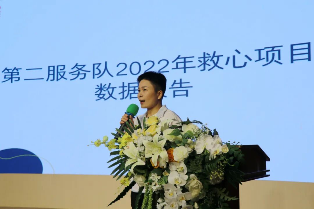 第二服务队“救心”行动委员会主任周惠群上台汇报第二服务队2022年度“救心”项目工作情况报告。2022年由于疫情原因,第二服务队资助的困难家庭先心病患儿数量并不多,但令人高兴的是这群受助的孩子们都已经顺利接受手术,恢复健康!新的一年,服务队将努力继续帮扶困难家庭先心病孩子,帮助他们重获新生。