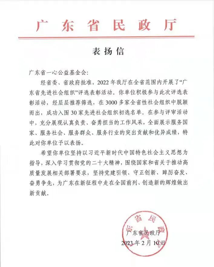 近日,广东省一心公益基金会收到一封来自广东省民政厅的表扬信。信中指出,我基金会在2022年度“广东省先进社会组织评选表彰活动”中,成功入围30家先进社会组织初选名单,充分展现志愿服务的精神与风采,贡献突出,成绩优异,特向我基金会给予表扬!