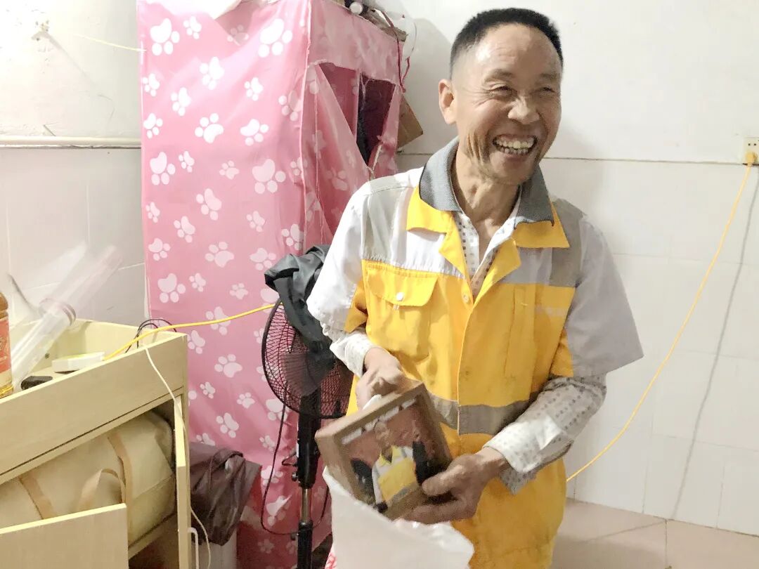 志愿者们几经周转联系上了杨爷爷,前往他的家中进行探访慰问。晚上7点,也许正是大家吃饭或在家休息的时间。然而这正是爷爷忙碌的时候,他需要赶在垃圾车来之前,把自己所负责的区域的垃圾回收到垃圾车里。爷爷说,他做环卫工人已经12年了,每天早上都是4点多起床,忙到大概11点,中午简单吃点东西、午休,下午2点多上班,一直到晚上7点多结束。