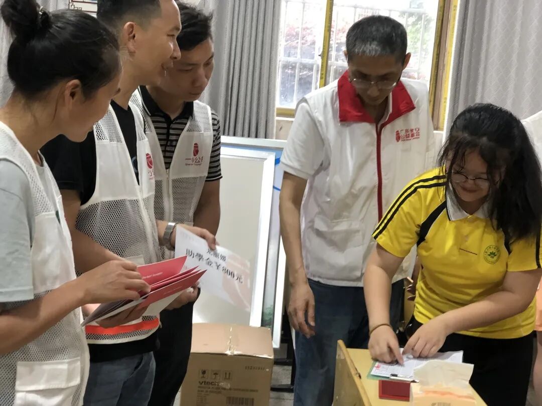 20日,大家到达蓝山县民族中学及新圩学校,向19户困难学生发放助学金,并给他们送上牛奶、蛋黄酥等生活物资及文具用品。