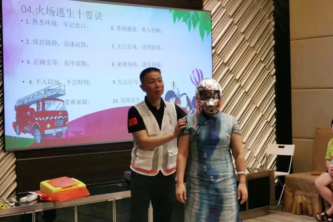 其后,导师讲解了发生火灾时的应变措施,从不同情况分析逃生路线,并请学员学习多种逃生方法。同时,导师分析了火灾浓烟的毒害性,介绍了防烟面具、灭火器等消防工具的使用方法。