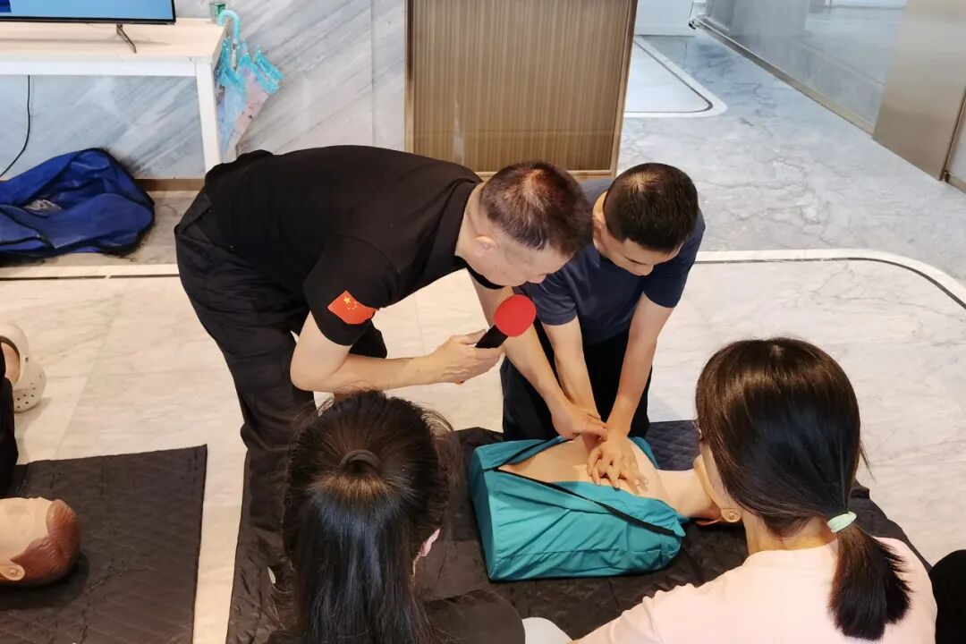 此次培训分为综合理论授课和模拟实操两个部分。培训导师结合课件与教学视频,向大家重点讲解了成人心肺复苏术的理论知识、胸外按压的注意技巧、自动体外除颤仪的使用方法以及海姆立克急救法的操作方法。在导师幽默风趣的解说下,枯燥的理论知识也变得有趣,学员们纷纷积极发言,课堂氛围活跃。学员在培训导师的耐心指导下,进行现场模拟实操。