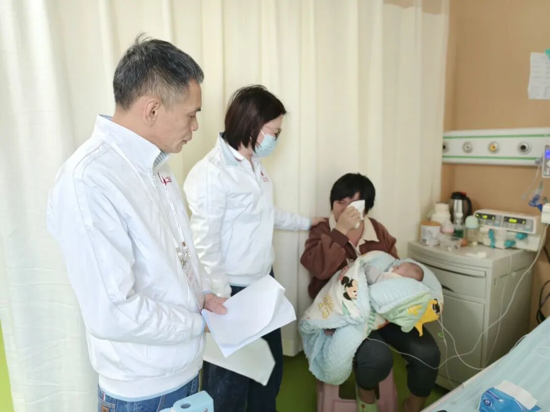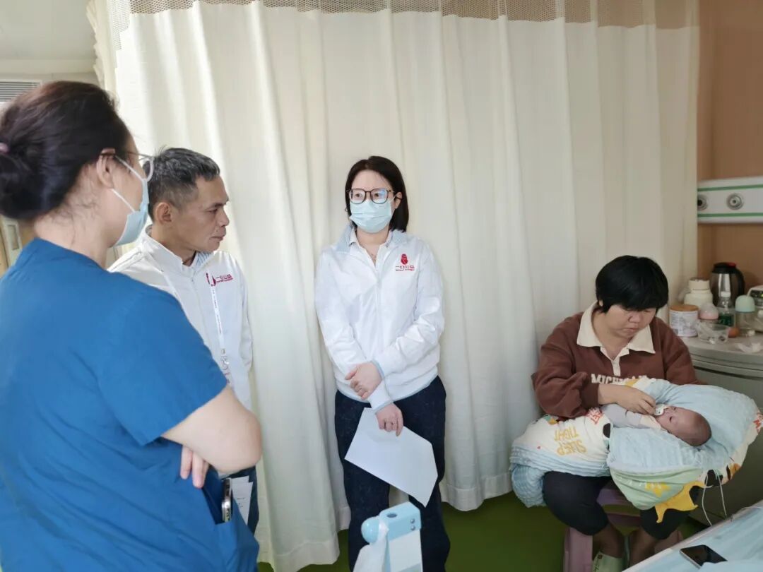 在省妇幼住院部2楼病房,队员们见到了小乐及其母亲。据了解,小乐仅2个月大,是早产儿,也是双胞胎中的哥哥。在母亲孕期检查时便发现小乐心脏异常,出生后确诊患有肺动脉瓣狭窄、卵圆孔未闭、三尖瓣反流等先心病。出生不久,小乐病情恶化,半夜接受了心脏急诊手术,手术非常成功。