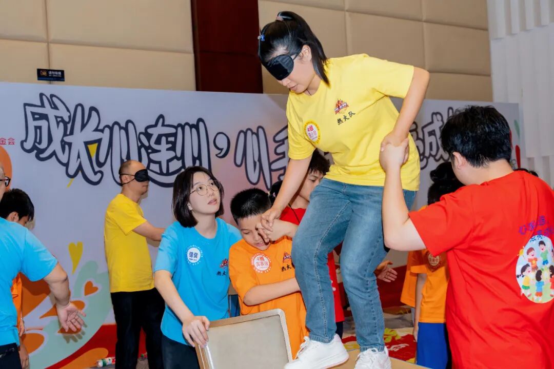 “漫步人生路”环节中,孩子们引导蒙上双眼的家长穿越障碍,既锻炼了孩子的责任感,也让家长体会到信任与放手的重要性。