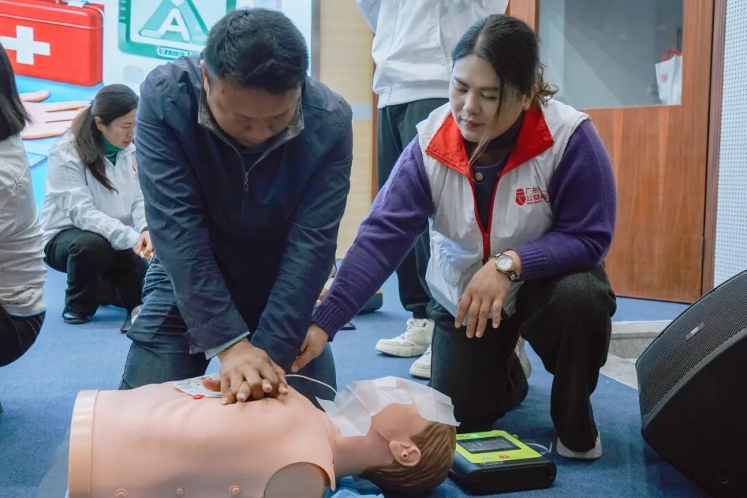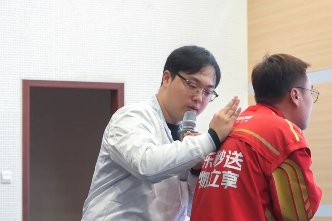 活动现场,84名学员专注而坐,他们有的是刚送完午餐订单的外卖小哥,有的是分拣完包裹的快递员,还有的是才停稳货车的司机师傅。本次培训紧扣日常生活与工作中可能遇到的紧急情况,重点围绕四项核心救命技能展开:心肺复苏术(CPR)、自动体外除颤器(AED)使用、应对气道异物梗阻的海姆立克急救法,以及创伤止血包扎技巧。
