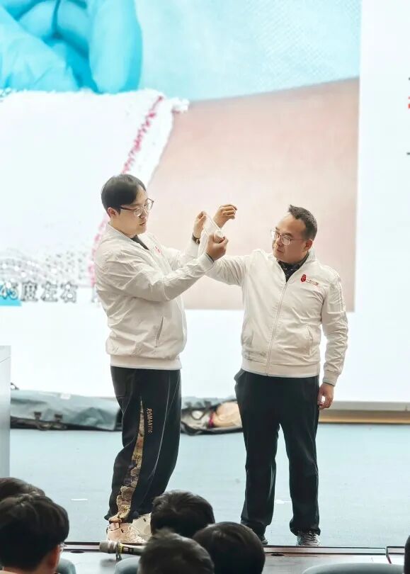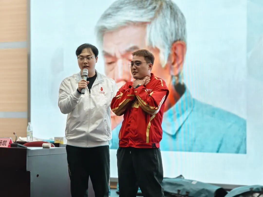 在海姆立克急救法与止血包扎教学环节,导师邀请一位外卖小哥和一位志愿者上台,分别演示针对成人、儿童及自身发生气道梗阻时的不同手法。绷带如何缠绕才能有效止血又不影响血液循环?伤口压迫点在哪里?学员们边看边模仿,手中比划、口中默念,力求将每一步印入脑海。