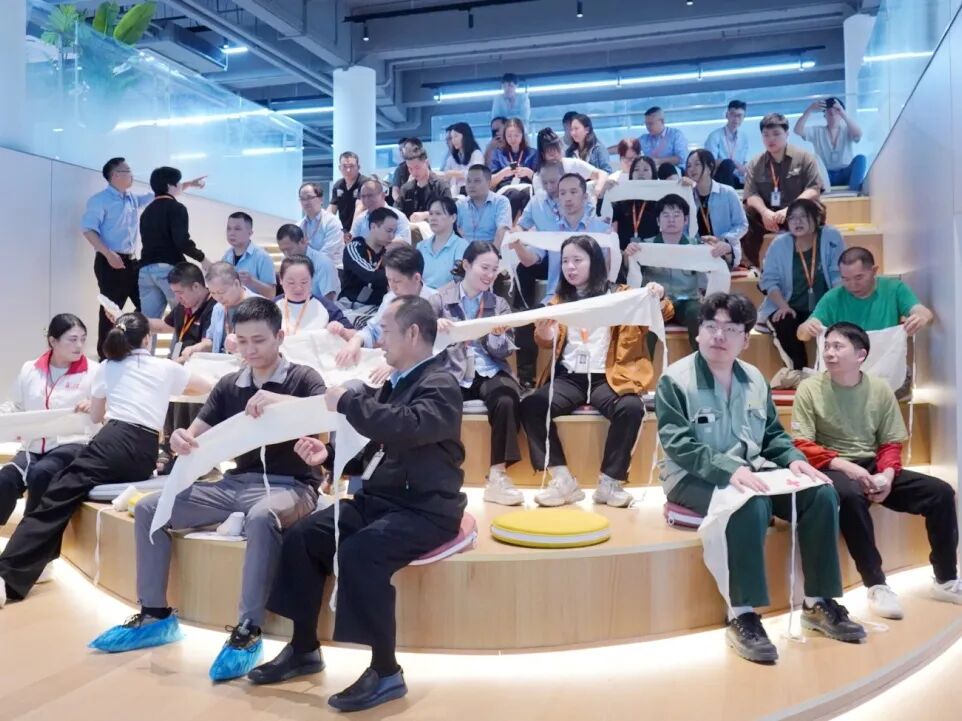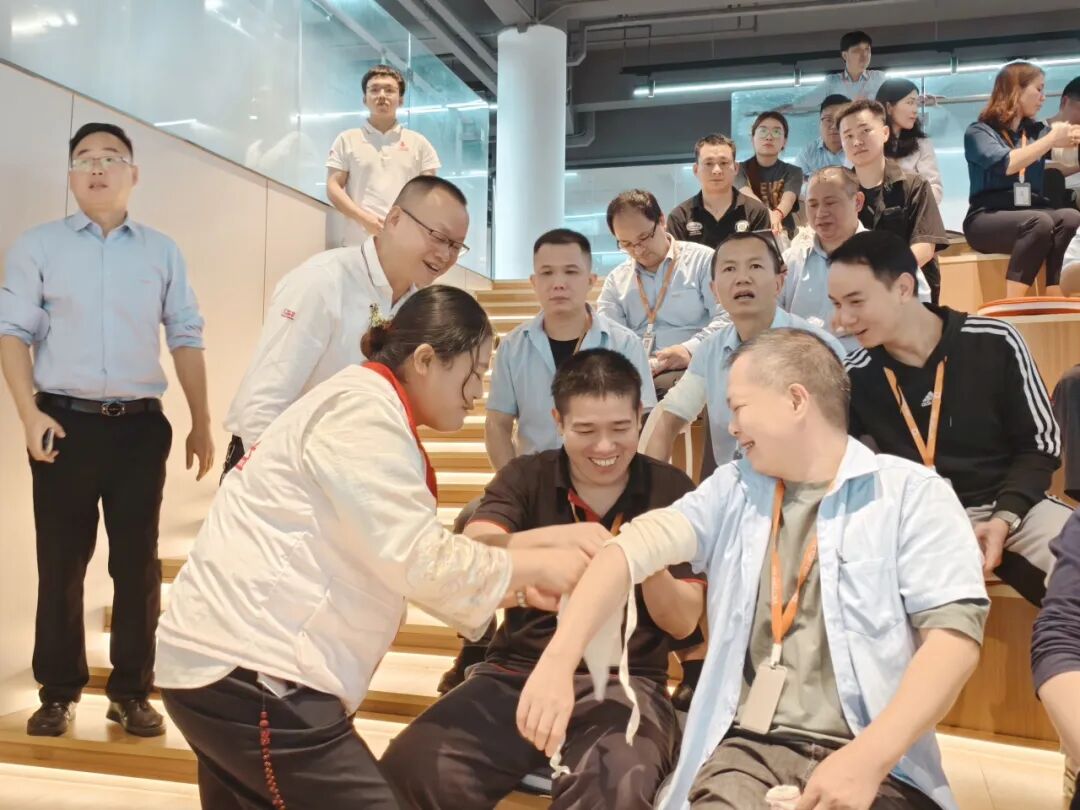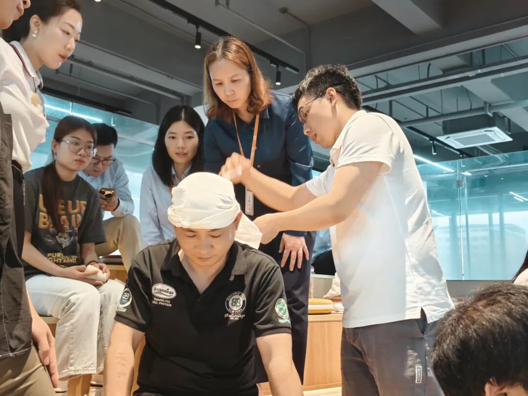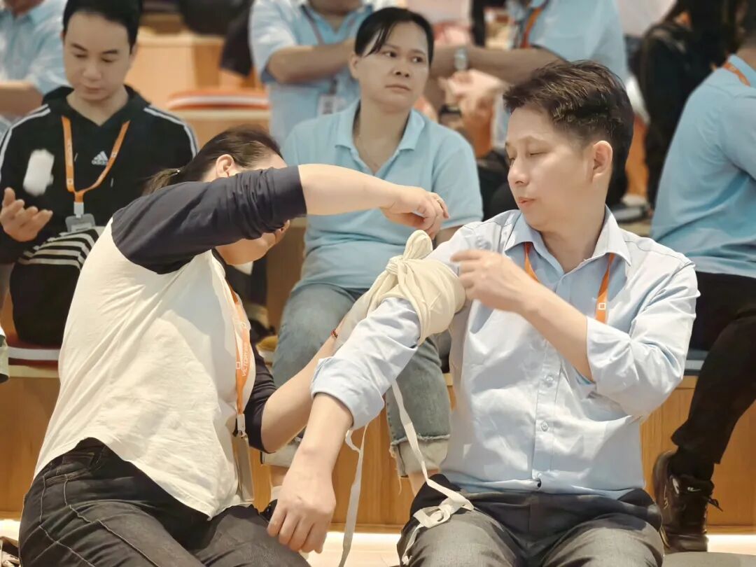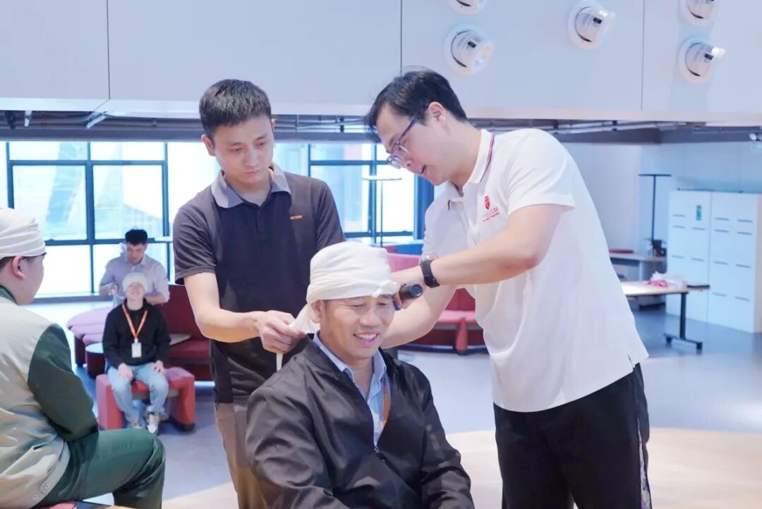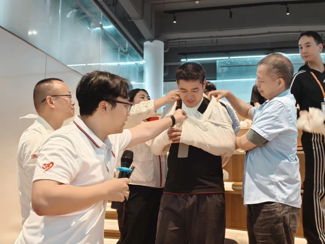 理论讲解后,第八服务队队员分组带领员工进行实操演练,逐一纠正动作。员工们边练边感慨:“以前遇到出血只会慌张,现在知道怎么正确止血了。”“原来烫伤不能乱抹东西,今天学到了真本事。”